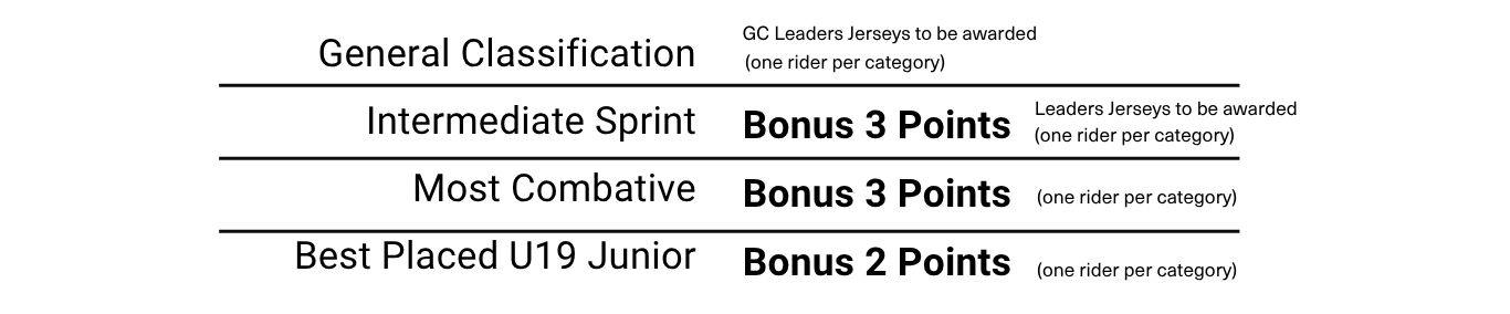 However, there will be a bonus individual point awarded for those riders within the winning teams on the day (Top 3 Teams Per Grade).Team points will go towards the Overall Team Prize (not to GC) - 1 Team prize per grade.